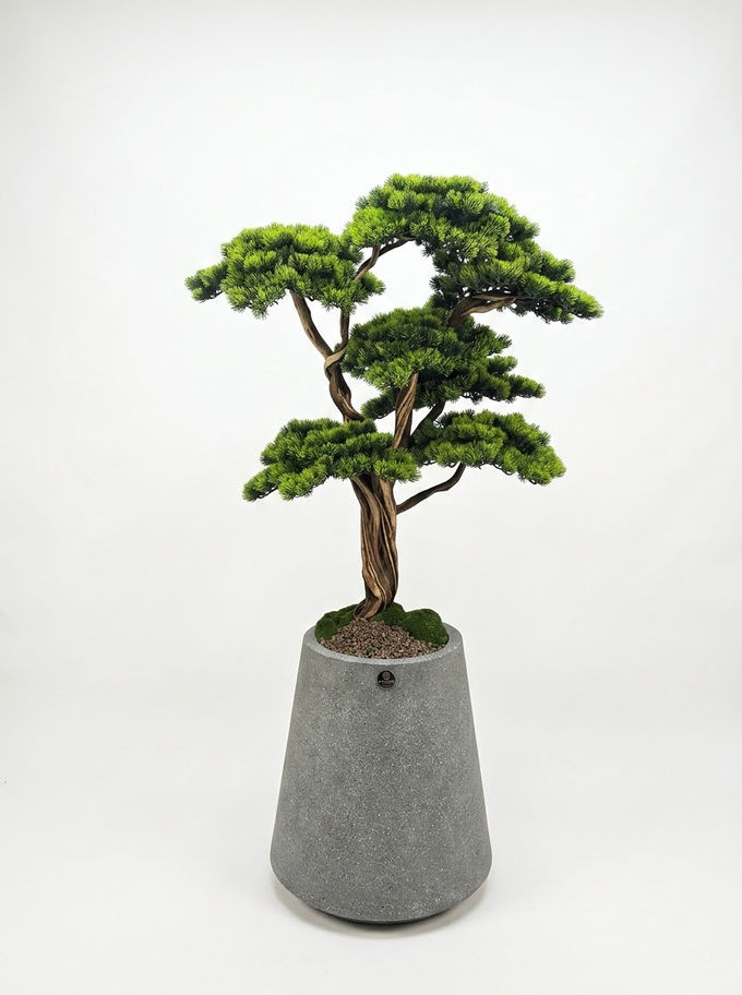 Modern Beton Saksı: Minimalist ve sağlam yapılı beton saksı, ağacın organik formuyla mükemmel bir denge oluşturarak endüstriyel bir şıklık sunar.