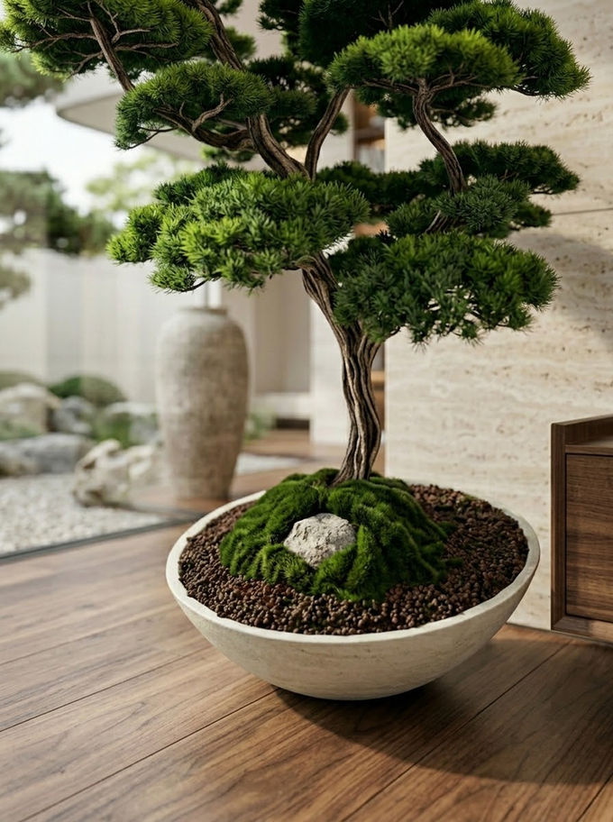 Our natural-looking bonsai trees meet concrete planters, a timeless material in industrial design. Designed with simple and modern lines, these concrete planters offer both durability and elegance to your spaces. The minimalist aesthetic of concrete highlights the natural trunk of each bonsai tree, while the artificial leaves create a long-lasting, maintenance-free beauty. Ideal for both indoor and outdoor spaces, this product adds a sophisticated touch to your living areas.